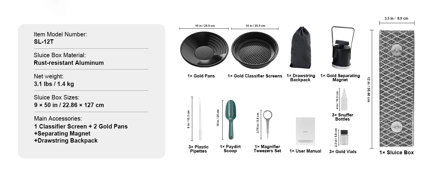 50-inch Gold Prospecting Kit: Our 23-piece gold panning kit includes everything you need, including 2 gold pans, 1 sluice box, 2 gold classifier screens, 1 gold separating magnet, 3 snuffer bottles, 3 plastic pipettes, 3 gold vials, 1 paydirt scoop, 1 spoon, 1 magnifier tweezers set, 4 crevice picks, and 1 drawstring backpack.