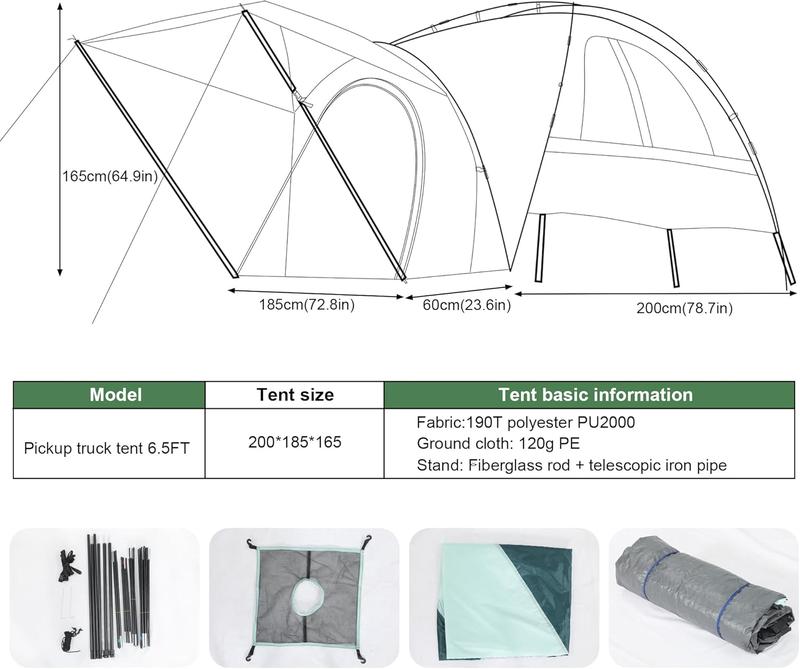 - Designed for truck beds: customized for 5.5~6.5ft truck beds, 5.5ft size 200*170*165cm/78.7*66.9*64.9inch, 6.5ft size 200*185*165cm/78.7*72.8*64.9 inch, suitable for a wide range of car models, easy to accommodate two people and other items, turning pickup trucks into mobile Campsite.